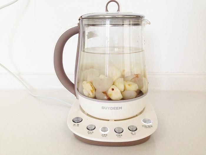 2、将处理好的食材放入养生壶,加水至1000ML左右,启动水果茶模式。